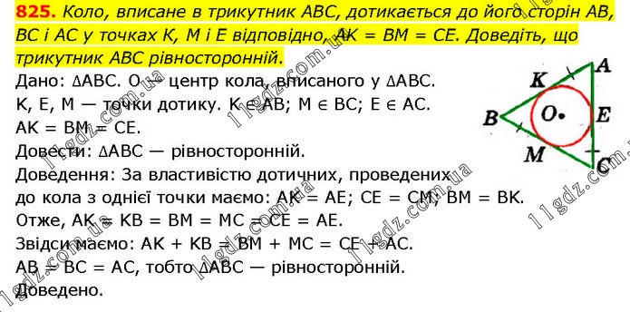 Коло, вписане в трикутник ABC, дотикається до його сторін AB, BC і AC у точках К, M і E відповідно, AK = BM = CE. Доведіть, що трикутник ABC рівносторонній. Дано: ∆АВС. O — центр кола, вписаного у ∆АВС. K, E, M — точки дотику. K ∈ AB; M ∈ BC; E ∈ AC. AK = BM = CE. Довести: ∆ABC — рівносторонній. Доведення: За властивістю дотичних, проведених до кола з однієї точки маємо: AK = AE; CE = CM; BM = BK. Отже, AK = KB = BM = MC = CE = AE. Звідси маємо: AK + KB = BM + MC = CE + AC. AB = BC = AC, тобто ∆ABC — рівносторонній. Доведено.