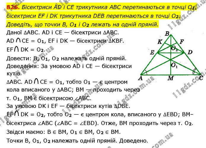 Бісектриси AD і CE трикутника ABC перетинаються в точці O1, бісектриси EF і DK трикутника DEB перетинаються в точці O2. Доведіть, що точки В, O1 і O2 лежать на одній прямій. Даної ∆ABC. AD і CE — бісектриси ∆ABC. AD CE = O1, EF і DK — бісектриси ∆KBF. EF DK = O2. Довести: B, O1, O2 належать одній прямій. Доведення: За умовою AD і CE — бісектриси кутів ∆АВС. AD CE = O1, тобто O1 — є центром кола вписаного у ∆АВС; BM — проходить через т. O1, BM є бісектрисою ∠ABC. За умовою DK і EF — бісектриси кутів ∆DBE. EF DK = O2, тобто O2 — є центром кола, вписаного у ∆EBD; BM – бісектриса ∠ABC (∠ABC = ∠EBD). Отже, BM проходить через т. O2. Звідси маємо: В ∈ BM, O1 ∈ BM, O2 ∈ BM. Точки В, O1, O2 належать одній прямій. Доведено.
