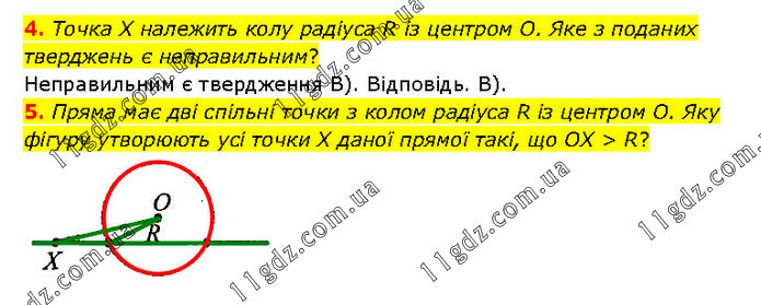 4. Точка X належить колу радіуса R із центром О. Яке з поданих тверджень є неправильним? Неправильним є твердження В). Відповідь. В). 5. Пряма має дві спільні точки з колом радіуса R із центром О. Яку фігуру утворюють усі точки X даної прямої такі, що OX > R?