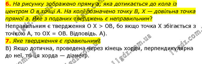 6. На рисунку зображено пряму а, яка дотикається до кола із центром O в точці А. На колі позначено точку В, X — довільна точка прямої а. Яке з поданих тверджень є неправильним? Неправильним є твердження О Х > ОВ, бо якщо точка X збігається з точкою А, то ОХ = ОВ. Відповідь. А). 7. Яке твердження є правильним? B) Якщо дотична, проведена через кінець хорди, перпендикулярна до неї, то ця хорда — діаметр.