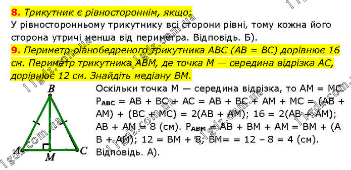 8. Трикутник є рівностороннім, якщо: У рівносторонньому трикутнику всі сторони рівні, тому кожна його сторона утричі менша від периметра. Відповідь. Б). 9. Периметр рівнобедреного трикутника ABC (AB = BC) дорівнює 16 см. Периметр трикутника ABM, де точка M — середина відрізка AC, дорівнює 12 см. Знайдіть медіану BM. Оскільки точка М — середина відрізка, то АМ = МС. РАВС = АВ + ВС + АС = АВ + ВС + АМ + МС = (АВ + АМ) + (ВС + МС) = 2(АВ + АМ); 16 = 2(АВ + АМ); АВ + АМ = 8 (см). РАВМ = АВ + ВМ + АМ = ВМ + (А В + АМ); 12 = ВМ + 8; ВМ= = 12 – 8 = 4 (см). Відповідь. А).