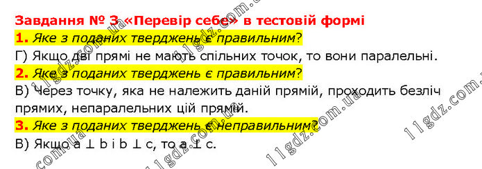 1. Яке з поданих тверджень є правильним? Г) Якщо дві прямі не мають спільних точок, то вони паралельні. 2. Яке з поданих тверджень є правильним? B) Через точку, яка не належить даній прямій, проходить безліч прямих, непаралельних цій прямій. 3. Яке з поданих тверджень є неправильним? B) Якщо a ⊥ b і b ⊥ c, то a ⊥ c.