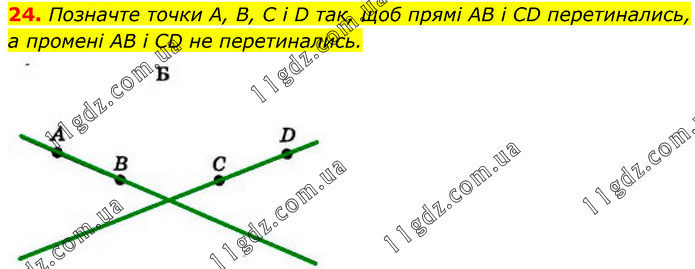 Позначте точки А, В, C і D так, щоб прямі AB і CD перетинались, а промені AB і CD не перетинались.