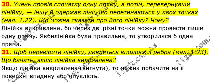 30. Учень провів спочатку одну пряму, а потім, перевернувши лінійку, — іншу й одержав лінії, що перетинаються у двох точках (мал. 1.22). Що можна сказати про його лінійку? Чому? Лінійка викривлена, бо через дві різні точки можна провести лише одну пряму. Якбилінійка була правильна, то утворилася б одна пряма. 31. Щоб перевірити лінійку, дивляться вподовж її ребра (мал. 1.23). Що бачать, якщо лінійка викривлена? Якщо лінійка викривлена (вигнута), то можна побачити на її поверхні впадину або опуклість.