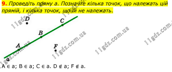 Проведiть пряму а. Позначте кiлька точок, що належать цiй прямiй, i кiлька точок, що їй не належать. А ∈ а; В ∈ а; С ∈ а. D ∉ a; F ∉ a.