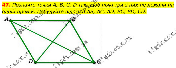 Позначте точки А, В, С, D так, щоб ніякі три з них не лежали на одній прямій. Побудуйте відрізки АВ, AC, AD, BC, BD, CD.