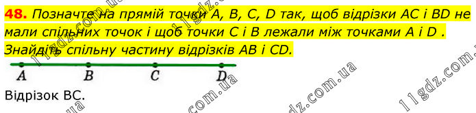 Позначте на прямій точки А, В, С, D так, щоб відрізки AC і BD не мали спільних точок і щоб точки C i B лежали між точками A i D . Знайдіть спільну частину відрізків AB і CD. Відрізок ВС.