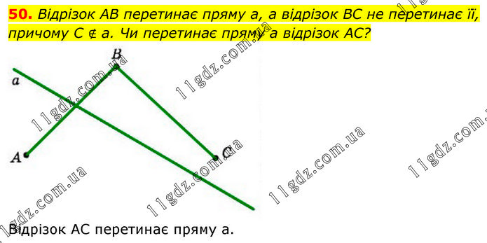 Відрізок AB перетинає пряму а, а відрізок BC не перетинає її, причому С ∉ а. Чи перетинає пряму а відрізок AC? Відрізок АС перетинає пряму а.