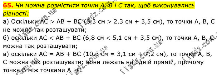 Чи можна розмістити точки А, В і C так, щоб виконувались рівності: а) Оскільки АС > АВ + ВС (6,3 см > 2,3 см + 3,5 см), то точки А, В, С не можна так розташувати; б) оскільки АС < АВ + ВС (6,8 см < 5,1 см + 3,5 см), то точки А, В, С можна так розташувати; в) оскільки АС = АВ + ВС (10,3 см = 3,1 см + 7,2 см), то точки А, В, С можна так розташувати: вони лежать на одній прямій, причому точка В між точками А і С.