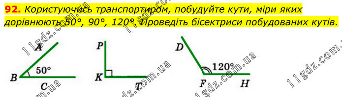 Користуючись транспортиром, побудуйте кути, міри яких дорівнюють 50°, 90°, 120°. Проведіть бісектриси побудованих кутів.
