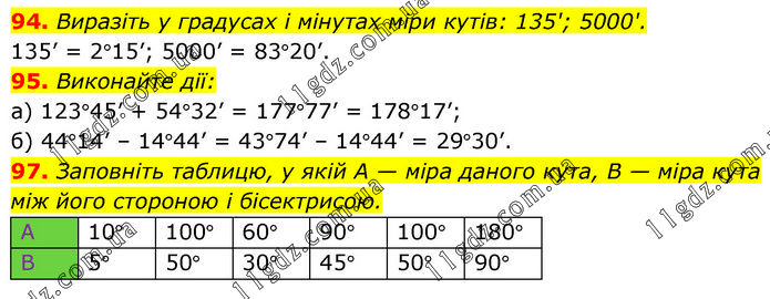 94. Виразіть у градусах і мінутах міри кутів: 135'; 5000'. 135’ = 2°15’; 5000’ = 83°20’. 95. Виконайте дії: а) 123°45’ + 54°32’ = 177°77’ = 178°17’; б) 44°14’ – 14°44’ = 43°74’ – 14°44’ = 29°30’. 97. Заповніть таблицю, у якій А — міра даного кута, В — міра кута між його стороною і бісектрисою. A 10° 100° 60° 90° 100° 180° B 5° 50° 30° 45° 50° 90°