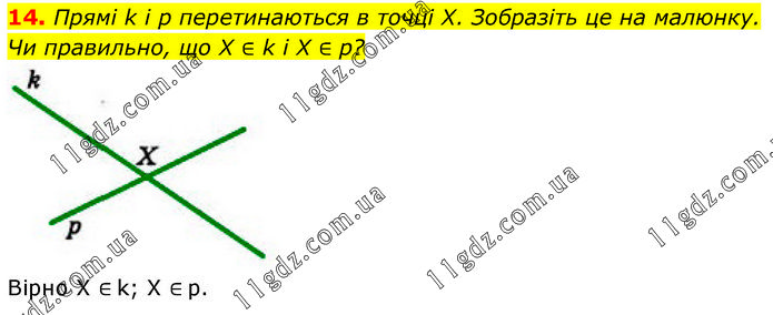 Прямі k i p перетинаються в точці X. Зобразіть це на малюнку. Чи правильно, що X ∈ k i X ∈ p? Вірно Х ∈ k; X ∈ p.