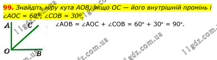 Знайдіть міру кута АОВ, якщо OC — його внутрішній промінь і ∠AOC = 60°, ∠COB = 30°. ∠АОВ = ∠АОС + ∠СОВ = 60° + 30° = 90°.