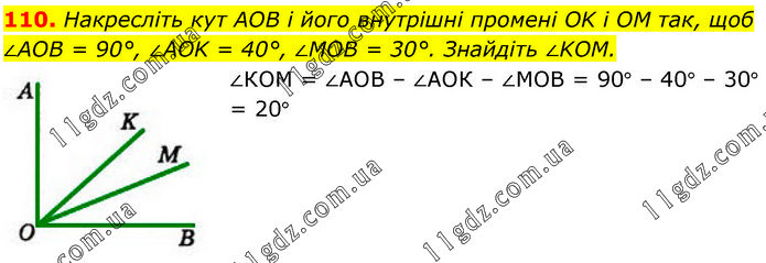 Накресліть кут AOB і його внутрішні промені OK і OM так, щоб ∠AOB = 90°, ∠AOK = 40°, ∠MOB = 30°. Знайдіть ∠KOM. ∠КОМ = ∠АОВ – ∠АОК – ∠МОВ = 90° – 40° – 30° = 20°