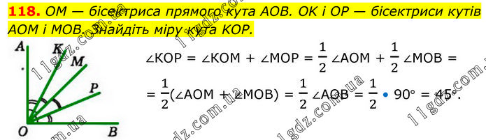 OM — бісектриса прямого кута АОВ. OK і OP — бісектриси кутів AOM і МОВ. Знайдіть міру кута KOP. ∠КОР = ∠КОМ + ∠МОР = 1/2 ∠АОМ + 1/2 ∠МОВ = = 1/2(∠АОМ + ∠МОВ) = 1/2 ∠АОВ = 1/2 • 90° = 45°.