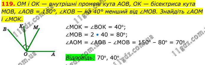 OM і OK — внутрішні промені кута АОВ, OK — бісектриса кута МОВ, ∠AOB = 150°, ∠KOB — на 40° менший від ∠MOB. Знайдіть ∠AOM і ∠MOK. ∠МОК = ∠ВОК = 40°; ∠МОВ = 2 • 40 = 80°; ∠АОМ = ∠АОВ – ∠МОВ = 150° – 80° = 70°. Відповідь: 70°, 40°.