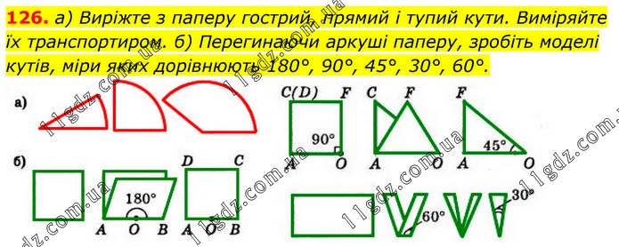 а) Виріжте з паперу гострий, прямий і тупий кути. Виміряйте їх транспортиром. б) Перегинаючи аркуші паперу, зробіть моделі кутів, міри яких дорівнюють 180°, 90°, 45°, 30°, 60°.