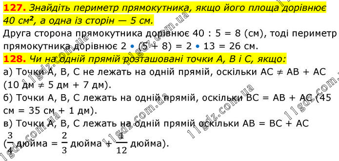 127. Знайдіть периметр прямокутника, якщо його площа дорівнює 40 см2, а одна із сторін — 5 см. Друга сторона прямокутника дорівнює 40 : 5 = 8 (см), тоді периметр прямокутника дорівнює 2 • (5 + 8) = 2 • 13 = 26 см. 128. Чи на одній прямій розташовані точки А, В і С, якщо: а) Точки А, В, С не лежать на одній прямій, оскільки АС ≠ АВ + АС (10 дм ≠ 5 дм + 7 дм). б) Точки А, В, С лежать на одній прямій, оскільки ВС = АВ + АС (45 см = 35 см + 1 дм). в) Точки А, В, С лежать на одній прямій оскільки АВ = ВС + АС (3/4 дюйма = 2/3 дюйма + 1/12 дюйма).