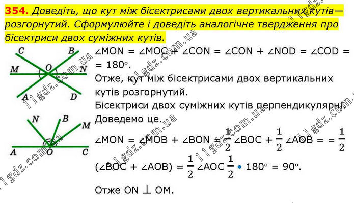 Доведіть, що кут між бісектрисами двох вертикальних кутів— розгорнутий. Сформулюйте і доведіть аналогічне твердження про бісектриси двох суміжних кутів. ∠MON = ∠MOC + ∠CON = ∠CON + ∠NOD = ∠COD = = 180°. Отже, кут між бісектрисами двох вертикальних кутів розгорнутий. Бісектриси двох суміжних кутів перпендикулярні. Доведемо це. ∠MON = ∠MOB + ∠BON = 1/2 ∠BOC + 1/2 ∠AOB = = 1/2 (∠BOC + ∠AOB) = 1/2 ∠AOC 1/2 • 180° = 90°. Отже ON ⊥ OM.