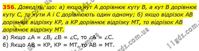 Доведіть, що: а) якщо кут А дорівнює куту В, а кут В дорівнює куту С, то кути A i C дорівнюють один одному; б) якщо відрізок AB дорівнює відрізку KP, a KP дорівнює відрізку MT, то відрізок AB дорівнює відрізку MT. а) Якщо ∠А = ∠В, ∠В = ∠С, то ∠А = ∠С. б) Якщо АВ = КР, КР = МТ, то АВ = МТ.