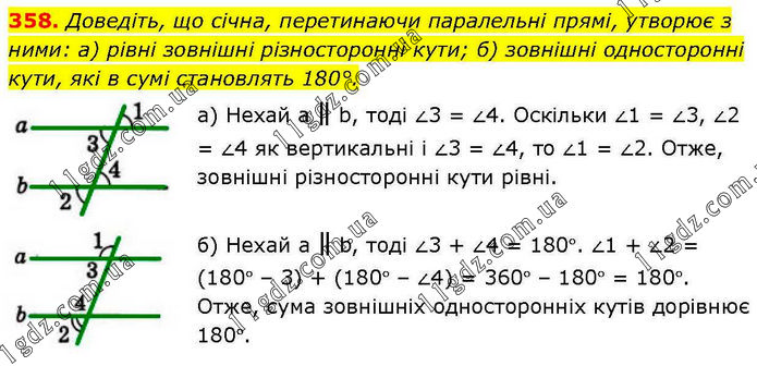 Доведіть, що січна, перетинаючи паралельні прямі, утворює з ними: а) рівні зовнішні різносторонні кути; б) зовнішні односторонні кути, які в сумі становлять 180°. а) Нехай а ∥ b, тоді ∠3 = ∠4. Оскільки ∠1 = ∠3, ∠2 = ∠4 як вертикальні і ∠3 = ∠4, то ∠1 = ∠2. Отже, зовнішні різносторонні кути рівні. б) Нехай а ∥ b, тоді ∠3 + ∠4 = 180°. ∠1 + ∠2 = (180° – 3) + (180° – ∠4) = 360° – 180° = 180°. Отже, сума зовнішніх односторонніх кутів дорівнює 180°.