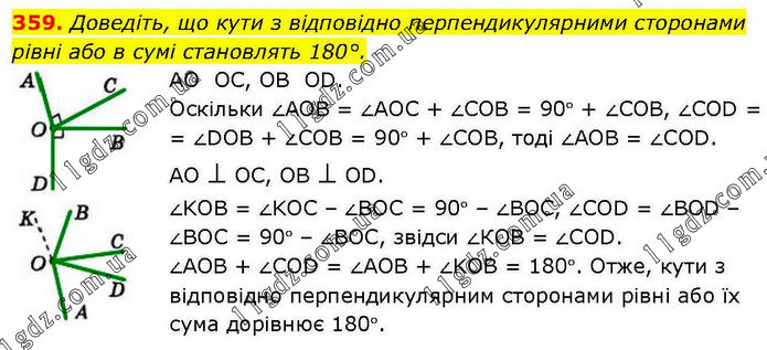 Доведіть, що кути з відповідно перпендикулярними сторонами рівні або в сумі становлять 180°. AO OC, OB OD. Оскільки ∠АОВ = ∠АОС + ∠СОВ = 90° + ∠СОВ, ∠СОD = = ∠DOB + ∠COB = 90° + ∠COB, тоді ∠АОВ = ∠СОD. AO ⊥ OC, OB ⊥ OD. ∠KOB = ∠KOC – ∠BOC = 90° – ∠BOC, ∠COD = ∠BOD – ∠BOC = 90° – ∠BOC, звідси ∠КОВ = ∠COD. ∠AOB + ∠COD = ∠AOB + ∠KOB = 180°. Отже, кути з відповідно перпендикулярним сторонами рівні або їх сума дорівнює 180°.
