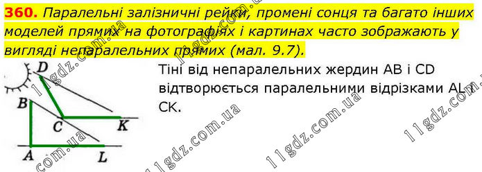 Паралельні залізничні рейки, промені сонця та багато інших моделей прямих на фотографіях і картинах часто зображають у вигляді непаралельних прямих (мал. 9.7). Тіні від непаралельних жердин АВ і СD відтворюється паралельними відрізками AL і CK.