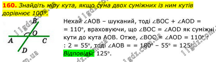Знайдіть міру кута, якщо сума двох суміжних із ним кутів дорівнює 100°. Нехай ∠АОВ – шуканий, тоді ∠ВОС + ∠АОD = = 110°, враховуючи, що ∠ВОС = ∠АОD як суміжні кути до кута АОВ. Отже, ∠ВОС = ∠АОD = 110° : : 2 = 55°, тоді ∠АОВ = = 180° – 55° = 125°. Відповідь: 125°.