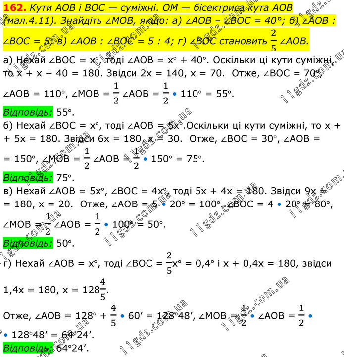 Кути AOB і BOC — суміжні. OM — бісектриса кута АОВ (мал.4.11). Знайдіть ∠МОВ, якщо: а) ∠AOB – ∠BOC = 40°; б) ∠AOB : ∠BOC = 5; в) ∠AOB : ∠BOC = 5 : 4; г) ∠BOC становить 2/5 ∠АОВ. а) Нехай ∠ВОС = х°, тоді ∠АОВ = х° + 40°. Оскільки ці кути суміжні, то х + х + 40 = 180. Звідси 2х = 140, х = 70. Отже, ∠ВОС = 70°, ∠АОВ = 110°, ∠МОВ = 1/2 ∠АОВ = 1/2 • 110° = 55°. Відповідь: 55°. б) Нехай ∠ВОС = х°, тоді ∠АОВ = 5х°.Оскільки ці кути суміжні, то х + + 5х = 180. Звідси 6х = 180, х = 30. Отже, ∠ВОС = 30°, ∠АОВ = = 150°, ∠МОВ = 1/2 ∠АОВ = 1/2 • 150° = 75°. Відповідь: 75°. в) Нехай ∠АОВ = 5х°, ∠ВОС = 4х°, тоді 5х + 4х = 180. Звідси 9х = = 180, х = 20. Отже, ∠АОВ = 5 • 20° = 100°. ∠ВОС = 4 • 20° = 80°, ∠МОВ = 1/2 ∠АОВ = 1/2 • 100° = 50°. Відповідь: 50°. г) Нехай ∠АОВ = х°, тоді ∠ВОС = 2/5х° = 0,4° і х + 0,4х = 180, звідси 1,4х = 180, х = 1284/5. Отже, ∠АОВ = 128° + 4/5 • 60’ = 128°48’, ∠MOB = 1/2 • ∠AOB = 1/2 • • 128°48’ = 64°24’. Відповідь: 64°24’.