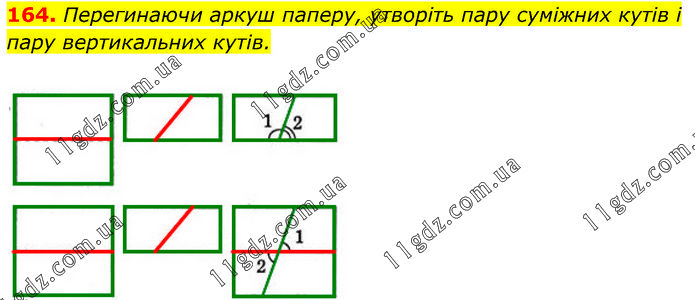 Перегинаючи аркуш паперу, утворіть пару суміжних кутів і пару вертикальних кутів.