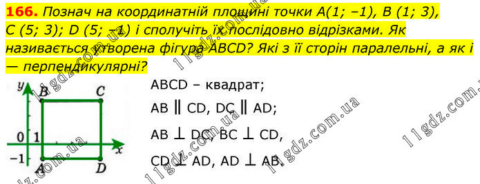 Познач на координатній площині точки А(1; –1), В (1; 3), C (5; 3); D (5; –1) і сполучіть їх послідовно відрізками. Як називається утворена фігура ABCD? Які з її сторін паралельні, а як і — перпендикулярні? АВСD – квадрат; АВ ∥ СD, DC ∥ AD; AB ⊥ DC, BC ⊥ CD, CD ⊥ AD, AD ⊥ AB.