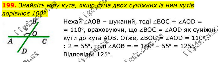 Знайдіть міру кута, якщо сума двох суміжних із ним кутів дорівнює 100°. Нехай ∠АОВ – шуканий, тоді ∠ВОС + ∠АОD = = 110°, враховуючи, що ∠ВОС = ∠АОD як суміжні кути до кута АОВ. Отже, ∠ВОС = ∠АОD = 110° : : 2 = 55°, тоді ∠АОВ = = 180° – 55° = 125°. Відповідь: 125°.