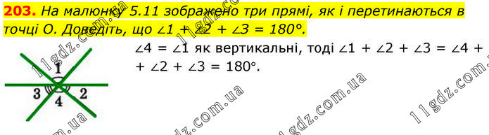 На малюнку 5.11 зображено три прямі, як і перетинаються в точці О. Доведіть, що ∠1 + ∠2 + ∠З = 180°. ∠4 = ∠1 як вертикальні, тоді ∠1 + ∠2 + ∠3 = ∠4 + + ∠2 + ∠3 = 180°.