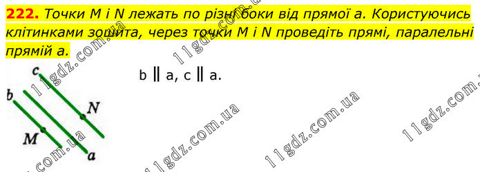 Точки M і N лежать по різні боки від прямої а. Користуючись клітинками зошита, через точки M i N проведіть прямі, паралельні прямій а. b ∥ a, c ∥ a.