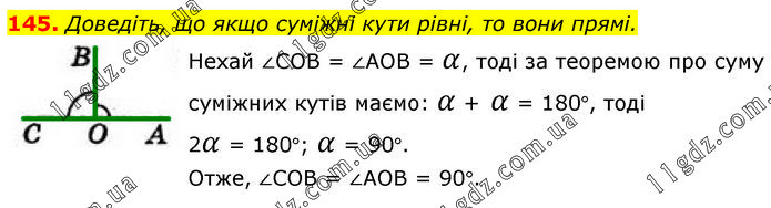 Доведіть, що якщо суміжні кути рівні, то вони прямі. Нехай ∠СОВ = ∠АОВ = α, тоді за теоремою про суму суміжних кутів маємо: α + α = 180°, тоді 2α = 180°; α = 90°. Отже, ∠СОВ = ∠АОВ = 90°.