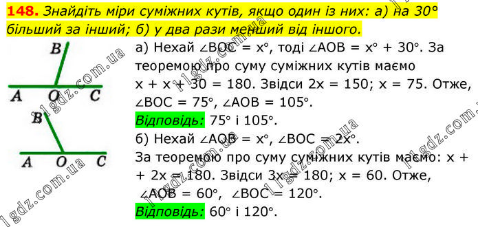 Знайдіть міри суміжних кутів, якщо один із них: а) на 30° більший за інший; б) у два рази менший від іншого. а) Нехай ∠ВОС = х°, тоді ∠АОВ = х° + 30°. За теоремою про суму суміжних кутів маємо х + х + 30 = 180. Звідси 2х = 150; х = 75. Отже, ∠ВОС = 75°, ∠АОВ = 105°. Відповідь: 75° і 105°. б) Нехай ∠АОВ = х°, ∠ВОС = 2х°. За теоремою про суму суміжних кутів маємо: х + + 2х = 180. Звідси 3х = 180; х = 60. Отже, ∠АОВ = 60°, ∠ВОС = 120°. Відповідь: 60° і 120°.