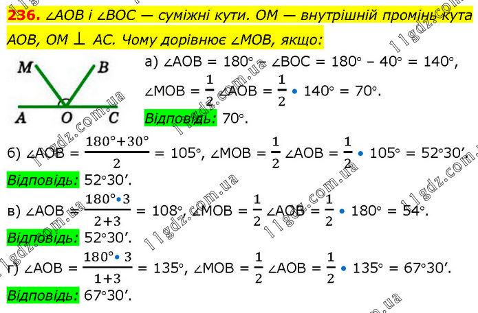 ∠AOB і ∠BOC — суміжні кути. OM — внутрішній промінь кута AOB, OM ⊥ AC. Чому дорівнює ∠MOB, якщо: а) ∠АОВ = 180° – ∠ВОС = 180° – 40° = 140°, ∠МОВ = 1/2 ∠АОВ = 1/2 • 140° = 70°. Відповідь: 70°. б) ∠АОВ = (180°+30°)/2 = 105°, ∠МОВ = 1/2 ∠АОВ = 1/2 • 105° = 52°30’. Відповідь: 52°30’. в) ∠АОВ = (180°•3)/(2+3) = 108°, ∠МОВ = 1/2 ∠АОВ = 1/2 • 180° = 54°. Відповідь: 52°30’. г) ∠АОВ = (180°• 3)/(1+3) = 135°, ∠МОВ = 1/2 ∠АОВ = 1/2 • 135° = 67°30’. Відповідь: 67°30’.