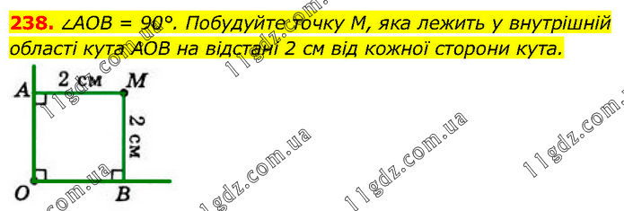 ∠AOB = 90°. Побудуйте точку М, яка лежить у внутрішній області кута AOB на відстані 2 см від кожної сторони кута.