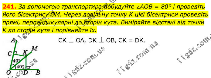 За допомогою транспортира побудуйте ∠AOB = 80° і проведіть його бісектрису ОМ. Через довільну точку K цієї бісектриси проведіть прямі, перпендикулярні до сторін кута. Виміряйте відстані від точки K до сторін кута і порівняйте їх. CK ⊥ OA, DK ⊥ OB, CK = DK.
