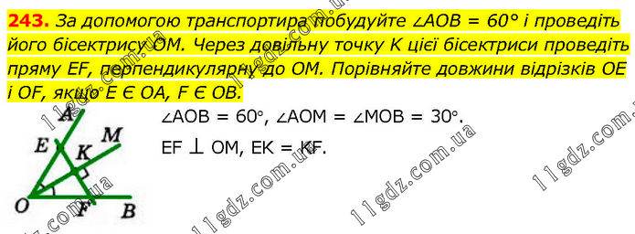 За допомогою транспортира побудуйте ∠AOB = 60° і проведіть його бісектрису ОМ. Через довільну точку K цієї бісектриси проведіть пряму EF, перпендикулярну до ОМ. Порівняйте довжини відрізків OE і OF, якщо E Є OA, F Є OB. ∠АОВ = 60°, ∠АОМ = ∠МОВ = 30°. EF ⊥ OM, EK = KF.