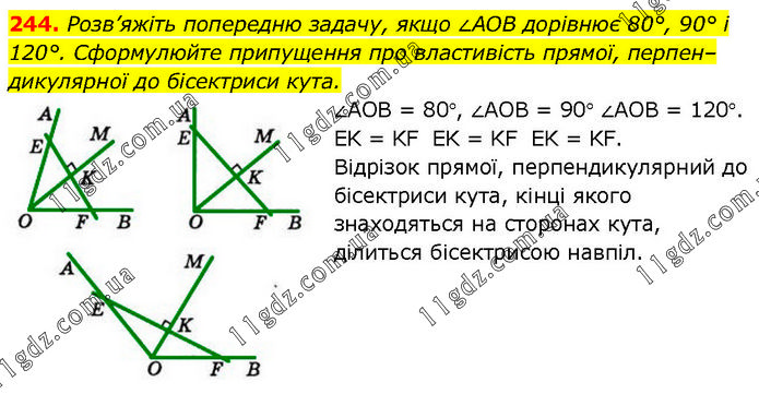 Розв’яжіть попередню задачу, якщо ∠AOB дорівнює 80°, 90° і 120°. Сформулюйте припущення про властивість прямої, перпендикулярної до бісектриси кута. ∠АОВ = 80°, ∠АОB = 90° ∠AОВ = 120°. EK = KF EK = KF EK = KF. Відрізок прямої, перпендикулярний до бісектриси кута, кінці якого знаходяться на сторонах кута, ділиться бісектрисою навпіл.