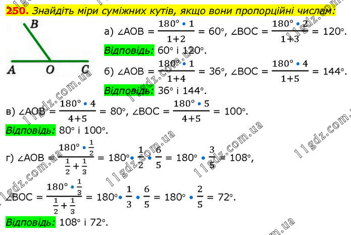Знайдіть міри суміжних кутів, якщо вони пропорційні числам: а) ∠АОВ = (180° • 1)/(1+2) = 60°, ∠ВОС = (180° • 2)/(1+3) = 120°. Відповідь: 60° і 120°. б) ∠АОВ = (180° • 1)/(1+4) = 36°, ∠ВОС = (180° • 4)/(1+5) = 144°. Відповідь: 36° і 144°. в) ∠АОВ = (180° • 4)/(4+5) = 80°, ∠ВОС = (180° • 5)/(4+5) = 100°. Відповідь: 80° і 100°. г) ∠АОВ = (180° • 1/2)/(1/2 + 1/3) = 180°• 1/2 • 6/5 = 180° • 3/5 = 108°, ∠ВОС = (180° • 1/3)/(1/2 + 1/3) = 180°• 1/3 • 6/5 = 180° • 2/5 = 72°. Відповідь: 108° і 72°.