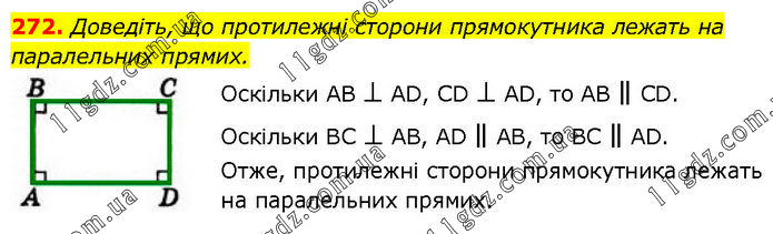 Доведіть, що протилежні сторони прямокутника лежать на паралельних прямих. Оскільки АВ ⊥ АD, CD ⊥ AD, то AB ∥ CD. Оскільки ВС ⊥ АВ, АD ∥ AВ, то BС ∥ АD. Отже, протилежні сторони прямокутника лежать на паралельних прямих.