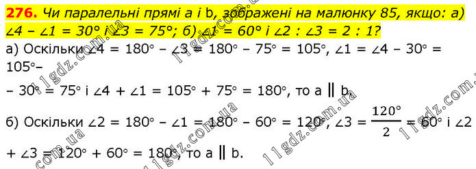 Чи паралельні прямі а і b, зображені на малюнку 85, якщо: а) ∠4 – ∠1 = 30° і ∠3 = 75°; б) ∠1 = 60° і ∠2 : ∠3 = 2 : 1? а) Оскільки ∠4 = 180° – ∠3 = 180° – 75° = 105°, ∠1 = ∠4 – 30° = 105°– – 30° = 75° і ∠4 + ∠1 = 105° + 75° = 180°, то a ∥ b. б) Оскільки ∠2 = 180° – ∠1 = 180° – 60° = 120°, ∠3 = (120°)/2 = 60° і ∠2 + ∠3 = 120° + 60° = 180°, то а ∥ b.