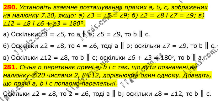 280. Установіть взаємне розташування прямих а, b, с, зображених на малюнку 7.20, якщо: а) ∠3 = ∠5 = ∠9; б) ∠2 = ∠8 і ∠7 = ∠9; в) ∠12 = ∠8 і ∠6 + ∠3 = 180°. а) Оскільки ∠3 = ∠5, то а ∥ b; ∠5 = ∠9, то b ∥ с. б) Оскільки ∠2 = ∠8, то 4 = ∠6, тоді а ∥ b; оскільки ∠7 = ∠9, то b ∥ с. в) Оскільки ∠12 = ∠8, то b ∥ с; оскільки ∠6 + ∠3 = 180°, то b ∥ а. 281. Січна n перетинає прямі а, b і с так, що кути позначені на малюнку 7.20 числами 2, 8 і 12, дорівнюють один одному. Доведіть, що прямі а, b і с попарно паралельні. Оскільки ∠2 = ∠8, то 2 = ∠6, тоді а ∥ b; оскільки ∠8 = ∠12, то b ∥ с.