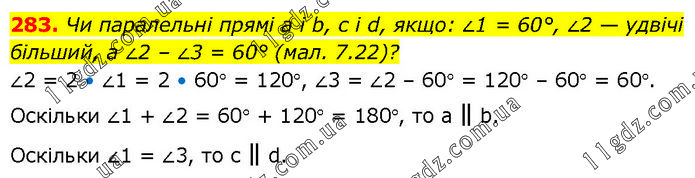 Чи паралельні прямі а і b, с і d, якщо: ∠1 = 60°, ∠2 — удвічі більший, a ∠2 – ∠3 = 60° (мал. 7.22)? ∠2 = 2 • ∠1 = 2 • 60° = 120°, ∠3 = ∠2 – 60° = 120° – 60° = 60°. Оскільки ∠1 + ∠2 = 60° + 120° = 180°, то a ∥ b. Оскільки ∠1 = ∠3, то с ∥ d.