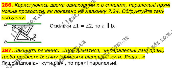 286. Користуючись двома однаковими к о синцями, паралельні прямі можна проводити, як показано на малюнку 7.24. Обґрунтуйте таку побудову. Оскільки ∠1 = ∠2, то a ∥ b. 287. Закінчіть речення: «Щоб дізнатися, чи паралельні дані прямі, треба провести їх січну і виміряти відповідні кути. Якщо...» Якщо відповідні кути рівні, то прямі паралельні.