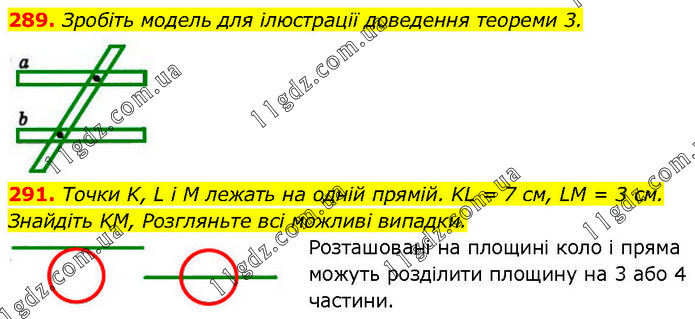 289. Зробіть модель для ілюстрації доведення теореми 3. 291. Точки K, L i M лежать на одній прямій. KL = 7 см, LM = 3 см. Знайдіть KM, Розгляньте всі можливі випадки. Розташовані на площині коло і пряма можуть розділити площину на 3 або 4 частини.