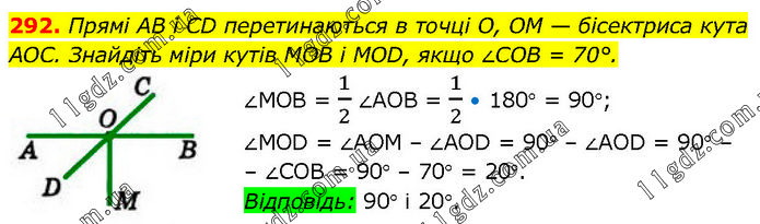 Прямі AB і CD перетинаються в точці О, OM — бісектриса кута АОС. Знайдіть міри кутів МОВ і MOD, якщо ∠COB = 70°. ∠МОВ = 1/2 ∠АОВ = 1/2 • 180° = 90°; ∠МОD = ∠AOM – ∠AOD = 90° – ∠AOD = 90° – – ∠COB = 90° – 70° = 20°. Відповідь: 90° і 20°.