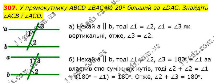 У прямокутнику ABCD ∠BAC на 20° більший за ∠DAC. Знайдіть ∠ACB і ∠ACD. а) Нехай а ∥ b, тоді ∠1 = ∠2, ∠1 = ∠3 як вертикальні, отже, ∠3 = ∠2. б) Нехай а ∥ b, тоді ∠1 = ∠2, ∠3 = 180° – ∠1 за властивістю суміжних кутів, тоді ∠2 + ∠2 = ∠1 + (180° – ∠1) = 180°. Отже, ∠2 + ∠3 = 180°.